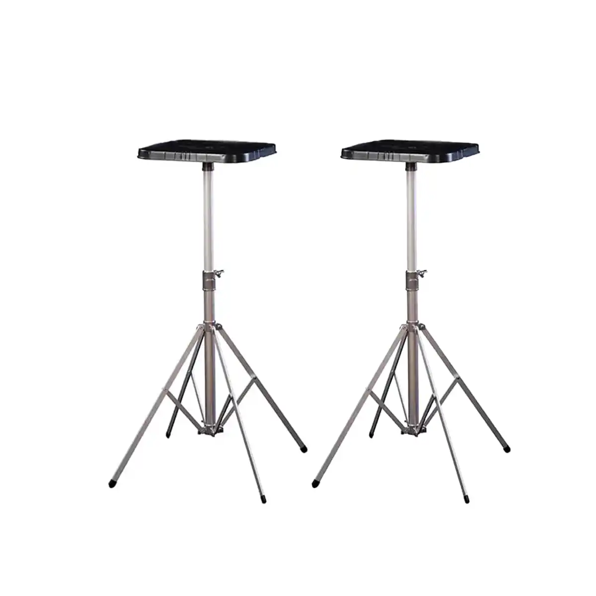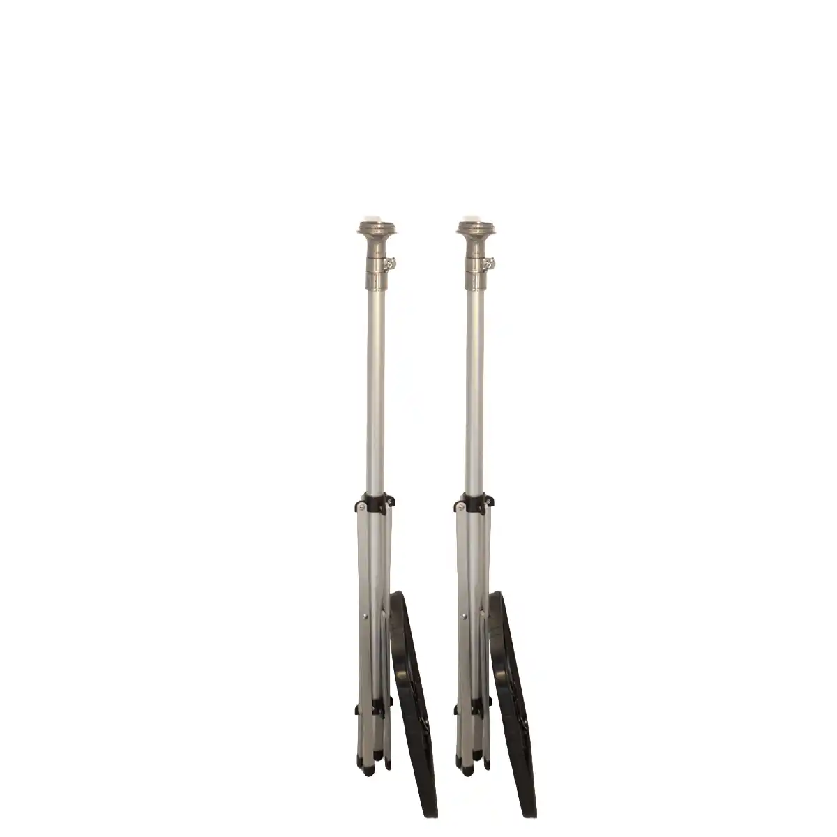 This product includes two identical display stands, designed to be strong, reliable, and lightweight. Each stand is constructed from anodized tubular aluminum with four solid aluminum legs for excellent stability and durability.