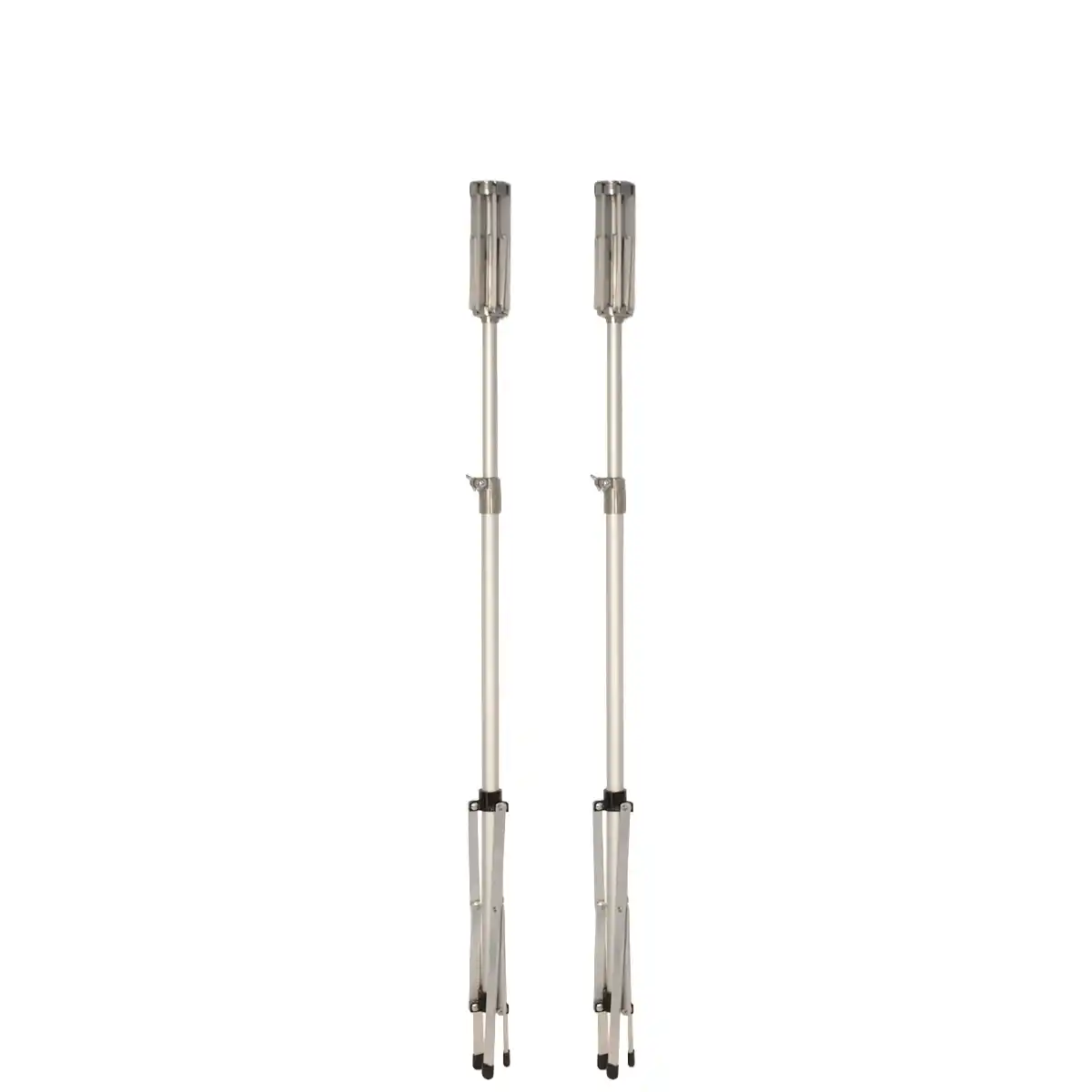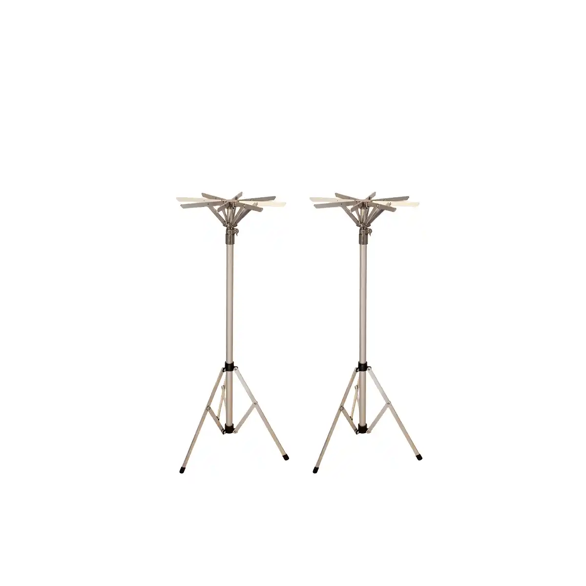 This set of two heavy-duty display stands features a compact, umbrella-style folding top for quick setup, stability, and easy transport. Constructed from anodized aluminum tubing, each stand is strong, lightweight, and built for repeated professional use.