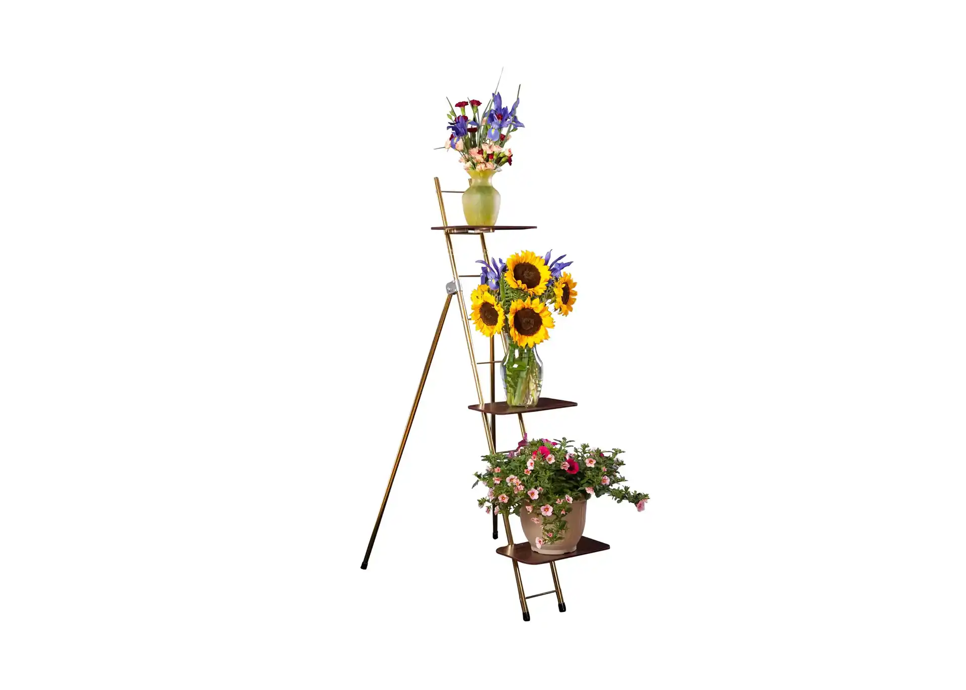 The XL Portable Ladder Rack combines durability, beauty, and flexibility to create the perfect display solution. Crafted from polished gold anodized aluminum tubing and featuring wood grain finished shelves, these racks elevate the look of any retail, floral, or art display.